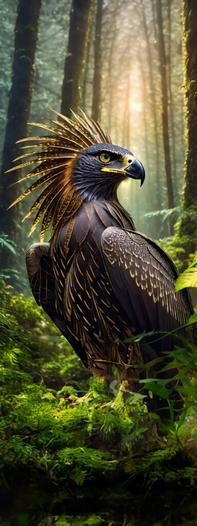 The Arachnis Raptor is a majestic and fearsome aerial predator, boasting a wingspan of up to 20 feet that exceeds the size of most eagles and hawks. Its feathers, a mix of brown and tan hues, provide effective camouflage, allowing it to blend seamlessly into its surroundings while soaring through the air with grace and power. The raptor’s most striking feature is its headdress-like feathers adorning its head, reminiscent of a Native American headdress, adding to its awe-inspiring appearance.