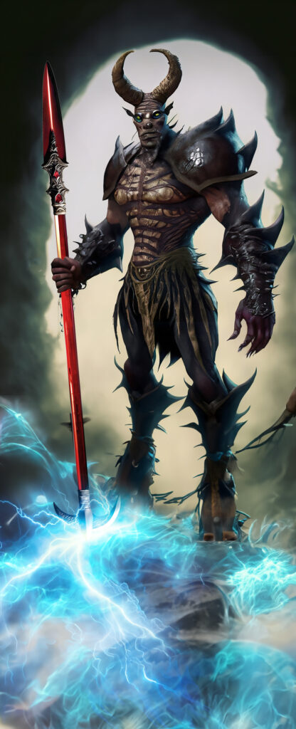 Matigahl, the revered female leader of the Ryovi, is worshiped as a deity due to her cunning leadership and formidable power among the devilish creatures. The Ryovi revere her as a powerful being deserving of worship, showcasing her arcane divinity and feared reputation through intricate tattoos and dark magic prowess. Ryovi wield the Soulrender, a Naginata created by Matigahl, with a scimitar blade and a large “adamantine” steel double “Shark’s Tooth” infused with dark magic properties.